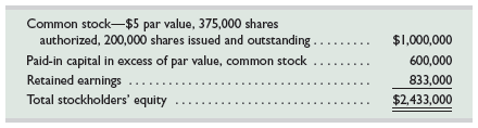 Common stock-$5 par value, 375,000 shares authorized, 200,000 shares issued and outstanding .... $1,000,000 Paid-in capital in excess of par value, common stock Retained earnings Total stockholders' equity 600,000 833,000 $2,433,000