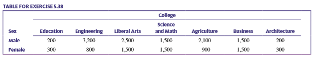 TABLE FOR EXERCISE 5.38 College Science Sex Education Engineering Liberal Arts and Math Agriculture Business Architecture Male 200 3,200 2,500 1,500 2,100 1,500 200 Female 300 800 1,500 1,500 900 1,500 300