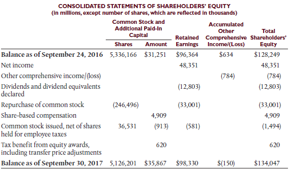 The table below is an excerpt from Apple Inc.âs Statement of Shareholdersâ Equity for its fiscal year ended September 30, 2017: