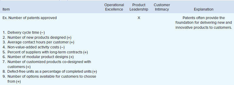 For each measure, place an X in one of the first three columns to indicate whether the measure would most likely be adopted by a company pursuing a strategy focused on operational excellence, product leadership, or customer intimacy. In the fourth column, provide an explanation for your answer.