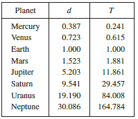 The table shows the mean (average) distances d of the planets from the sun (taking the unit of measurement to be the distance from the earth to the sun) and their periods T (time of revolution in years).