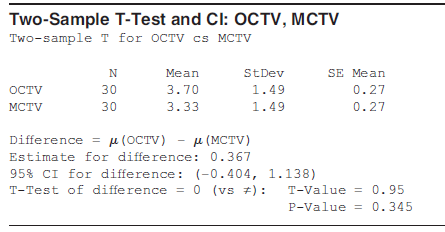 The table shows the Minitab output for a two-sample t-test for the number of televisions owned in households of random samples of students at two different community colleges. Each individual was randomly chosen independently of the others; the students were not chosen as pairs or in groups. One of the schools is in a wealthy community (MC), and the other (OC) is in a less wealthy community. Test the hypothesis that the population means are not the same, using a significance level of 0.05. See page 501 for guidance.