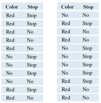 Create a two-way table to summarize these data. Use Red and No for the columns (across the top) and Stop and No for the rows. (We gave you an orientation of the table so that your answers would be easy to compare.)