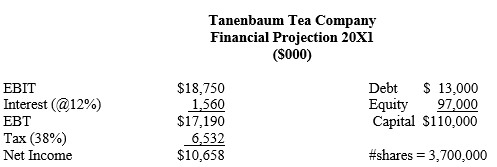 Tanenbaum Tea Company Financial Projection 20X1 (S000) $18,750 1,560 $17,190 6,532 $10,658 $ 13,000 97,000 Capital $110,000 ЕBIT Debt Interest (@12%) Equity EBT Таx (38%) Net Income #shares = 3,700,000