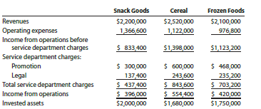 Snack Goods Cereal Frozen Foods Revenues $2,200,000 $2,520,000 $2,100,000 Operating expenses Income from operations before service department charges Service department charges: 1366,600 1,122,000 976,800 $ 833,400 $1,398,000 $1,123,200 Promotion $ 300,000 $ 600,000 $ 468,000 Legal Total service department charges Income from operations 137,400 $ 437,400 $ 396,000 $2,000,000 243,600 $ 843,600 $ 554,400 $1,680,000 235,200 $ 703,200 $ 420,000 $1,750,000 Invested assets