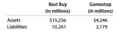 Best Buy Gamestop (in millions) (in millions) Assets $15,256 $4,246 Liabilities 10,261 2,179