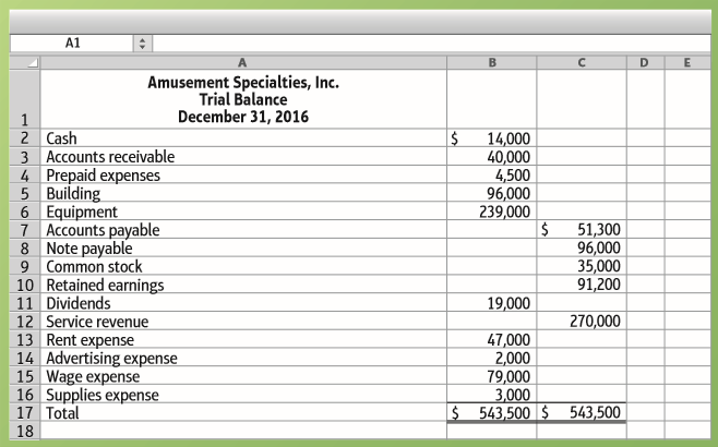A1 E Amusement Specialties, Inc. Trial Balance December 31, 2016 1 2 Cash 3 Accounts receivable 4 Prepaid expenses 5 Building 6 Equipment 7 Accounts payable 8 Note payable 9 Common stock 10 Retained earnings 11 Dividends 12 Service revenue 13 Rent expense 14 Advertising expense 15 Wage expense 16 Supplies expense 17 Total 14,000 40,000 4,500 96,000 239,000 51,300 96,000 35,000 91,200 19,000 270,000 47,000 2,000 79,000 3,000 $ 543,500 $ 543,500 18