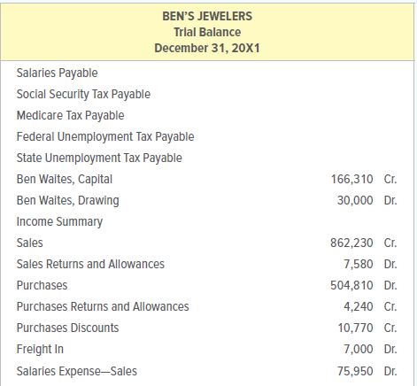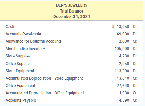 The unadjusted trial balance of Benâs Jewelers on December 31, 20X1, the end of its fiscal year, appears below.