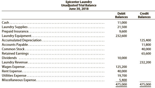 Eplcenter Laundry Unadjusted Trial Balance June 30, 2018 Debit Credit Balances Balances Cash.... 11,000 Laundry Supplies . Prepaid Insurance. Laundry Equipment... Accumulated Depreciation Accounts Payable.. 21,500 9,600 232,600 125,400 11,800 Common Stock . 40,000 Retained Earnings 65,600 Dividends 10,000 Laundry Revenue. Wages Expense.. Rent Expense.. Utilities Expense. Miscellaneous Expense.. 232,200 125,200 40,000 19,700 5,400 475,000 475,000