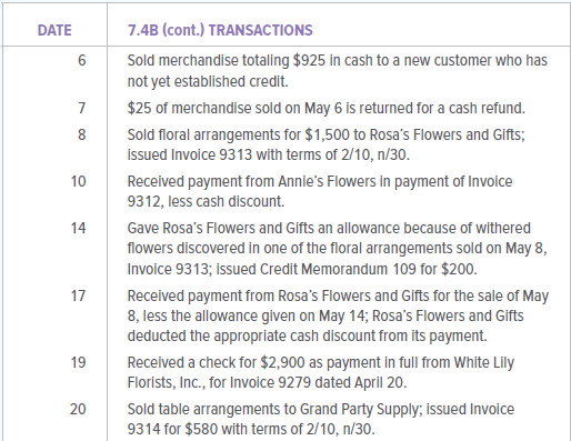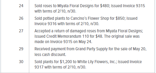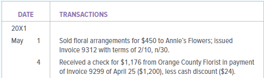 The Urban Florist is a wholesale shop that sells flowers, plants, and plant supplies. Transactions involving sales and cash receipts for the firm during May 20X1 follow. The firm sells its merchandise for cash and on open account. During May, The Urban Florist engaged in the following transactions: