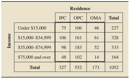The U.S. Census Bureau compiles information on money income of people by type of residence and publishes its finding in Current Population Reports. Independent simple random samples of people residing inside principal cities (IPC), outside principal cities but within metropolitan areas (OPC), and outside metropolitan areas (OMA), gave the following data on income level.