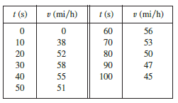 The velocity of a car was read from its speedometer at 10-second intervals and recorded in the table. Use the Midpoint Rule to estimate the distance traveled by the car.