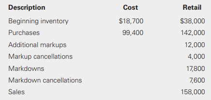 > On March 1, Year 1, LuxWear Inc. had beginning inventory and purchases at cost of $50,000 and $20,000, respectively. The beginning inventory and purchases had a retail value of $75,000 and $30,000, respectively. The company had sales of $60,000, as well