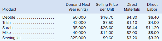 The Walton Toy Company manufactures a line of dolls and a sewing kit. Demand for the companyâs products is increasing, and management requests assistance from you in determining an economical sales and production mix for the coming year. The company has provided the following data: