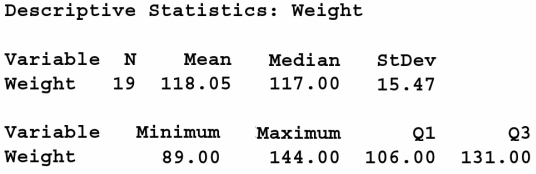 The weights (oz) of nineteen babies born in Madison, Wisconsin, are summarized in the computer output.