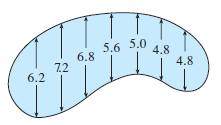 The widths (in meters) of a kidney-shaped swimming pool were measured at 2-meter intervals as indicated in the figure. Use Simpsonâs Rule to estimate the area of the pool.