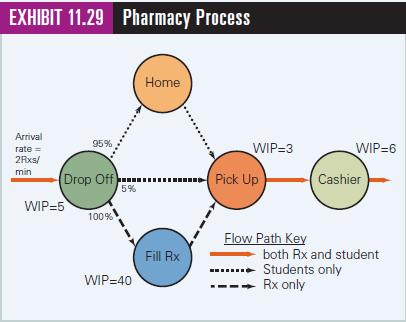 The Wilcox Student Health Center has just implemented a new computer system and service process to âimprove efficiency.â The process flowchart and analysis framework is also provided. As pharmacy manager, you are concerned about waiting time and its potential impact on college students who âget no respect.â All prescriptions (Rxs) go through the process shown in Exhibit 11.29.