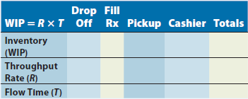 Assume that students arrive to drop off Rxs at a steady rate of two Rxs per minute, with an average of one Rx per student. The average number of students in process (assume waiting and being serviced) at each station is drop offâfive students, pick upâthree students and pay cashierâsix students.