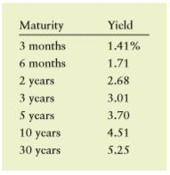 Maturity Yield 3 months 1.41% 6 months 1.71 2 years 3 years 2.68 3.01 5 years 10 years 30 ycars 3.70 4.51 5.25