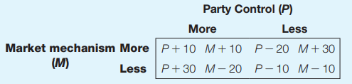 This exercise tries to illustrate a debate in a centralized economy, which is in the process of being modernized, with a single political party. Social stability is the main concern of the government, but it faces two obstacles: one being support a strengthening of the control of the party (P, party control supporter), the other adopt a more market approach (M, market supporter) with free enterprises and price liberalization. The following table represents payoffs for each side. Think of a payoff as a measure of influence in the political governing bodies: if party control supporter accepts a weakening of the party and a market supporter obtains more market mechanisms, P receives a negative payoff of â20 and M a positive payoff of 30.