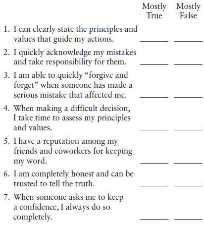 Interpretation: Each of the questions above pertains to some aspect of ethical maturity. Ethical maturity means that you have the moral awareness to recognize the ethical elements of a given situation. In addition, it means the ability not only to judge right from wrong but the autonomy to make the ethical choice under difficult circumstances. Study the specific questions for which you scored Mostly True or Mostly False to learn more about your specific strengths and weaknesses. Think about what influences your ethical behavior and decisions, such as the need for success or approval.