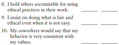 This exercise will help you better understand the concept of ethics and what it means to you. It probably will not happen right away, but soon enough in your duties as an organization manager, you will be confronted with a situation that will test the strength of your ethical beliefs or your sense of justice. When answering the questions below, think about times when you were part of a student or work group. To what extent does each of the following statements characterize your behavior when working with others in a group?