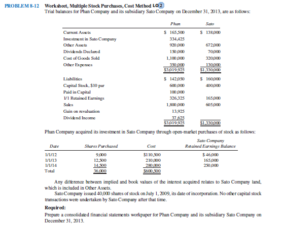 Refer to Problem 8-12. Prepare the consolidated financial statement workpaper for Phan Company and its subsidiary Sato Company on December 31, 2014. Use the cost method.