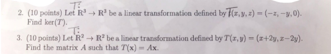 2. (10 points) Let R³ → R³ be a linear transformation defined by (x, y, z) = (-z, -y,0). Find ker(T). 3. (10 points) Let R² → R² be a linear transformation defined by T(x, y) = (x+2y, x-2y). Find the matrix A such that T(x) = Ax.