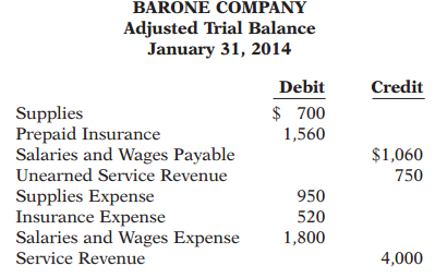 BARONE COMPANY Adjusted Trial Balance January 31, 2014 Debit Credit $ 700 1,560 Supplies Prepaid Insurance Salaries and Wages Payable Unearned Service Revenue $1,060 750 Supplies Expense Insurance Expense Salaries and Wages Expense 950 520 1,800 Service Revenue 4,000