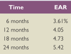 Time EAR 6 months 3.61% 12 months 18 months 4.05 4.73 24 months 5.42