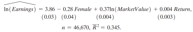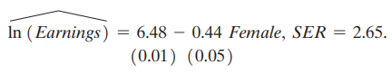 a. Let Female be an indicator variable that is equal to 1 for females and 0 for males. A regression of the logarithm of earnings on Female yields
