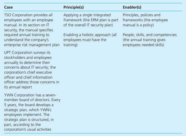 Case Principle(s) Enabler(s) Principles, policies and TSO Corporation provides all employees with an employee Applying a single integrated framework (the ERM plan is part frameworks (the employee of the overall IT security plan) manual. In its section on IT manual is a policy) security, the manual specifies required annual training to understand the company's enterprise risk management plan training) Enabling a holistic approach (all People, skills, and competencies (the annual training gives employees needed skills) employees must have the UPT Corporation surveys its stockholders and employees annually to determine their concerns about IT security; the corporation's chief executive officer and chief information officer address those concerns in its annual report YWN Corporation has a seven- member board of directors. Every 5 years, the board develops a strategic plan, which YWN's employees implement. The strategic plan is structured, in part, according to the corporation's usual activities