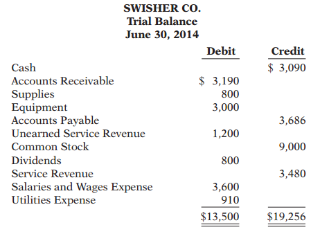 SWISHER CO. Trial Balance June 30, 2014 Debit Credit Cash $ 3,090 Accounts Receivable $ 3,190 Supplies Equipment Accounts Payable Unearned Service Revenue 800 3,000 3,686 1,200 Common Stock 9,000 Dividends 800 Service Revenue 3,480 Salaries and Wages Expense Utilities Expense 3,600 910 $13,500 $19,256