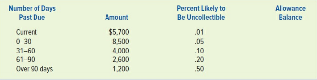Number of Days Past Due Percent Likely to Be Uncollectible Allowance Amount Balance Current $5,700 .01 .05 0-30 31-60 61-90 8,500 4,000 2,600 1,200 .10 .20 Over 90 days .50