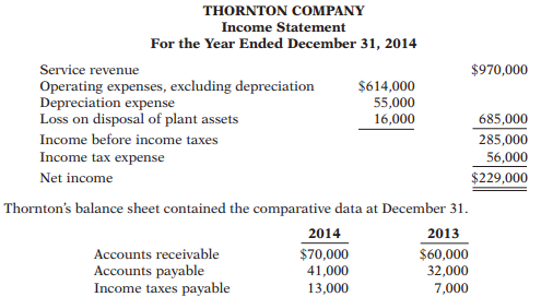 THORNTON COMPANY Income Statement For the Year Ended December 31, 2014 Service revenue $970,000 Operating expenses, excluding depreciation depreciation expense Loss on disposal of plant assets $614,000 55,000 16,000 685,000 Income before income taxes 285,000 Income tax expense 56,000 Net income $229,000 Thornton's balance sheet contained the comparative data at December 31. 2014 2013 Accounts receivable Accounts payable Income taxes payable $70,000 41,000 $60,000 32,000 7,000 13,000