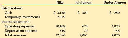 Nike lululemon Under Armour Balance sheet: Cash $ 3,138 $ 501 $ 250 Temporary investments 2,319 Income statement: Operating expenses Depreciation expense 10,469 628 1,823 649 73 145 Total revenues 32,376 2,061 4,825