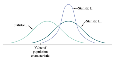 Three different statistics are being considered for estimating a population characteristic. The sampling distributions of the three statistics are shown in the following illustration: