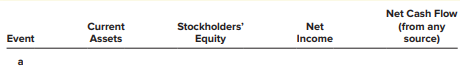 c. Declared and paid a cash dividend to stockholders. Indicate the immediate effects of the events on the financial measurements in the four column headings listed. Use the code letters I for increase, D for decrease, and NE for no effect.