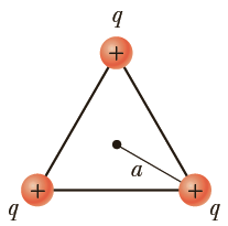 Three identical point charges each of charge q are located at the vertices of an equilateral triangle as in Figure P16.16. The distance from the center of the triangle to each vertex is a.