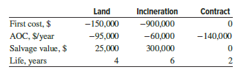Three methods to dispose of nonhazardous waste have been developedâland application, fluidizedbed incineration, and private disposal contract. Use AW analysis and an associated scatter chart of AW versus i values to select the economically best alternative for interest rates between i = 6 % and i = 24% in 3% increments.