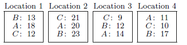 Location 1 Location 2 Location 3 Location 4 C: 21 A: 20 B: 23 C: 9 B: 12 A: 14 A: 11 C: 10 В: 17 B: 13 А: 18 C: 12