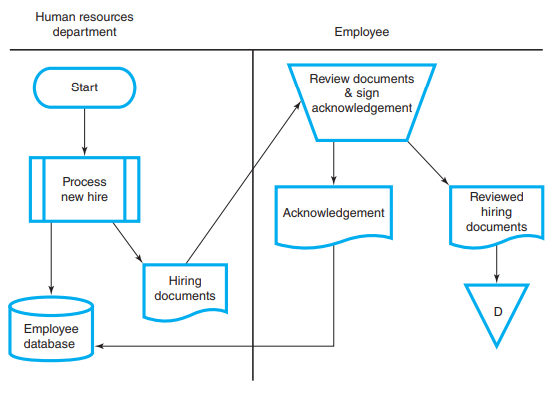 Human resources department Employee Review documents & sign acknowledgement Start Process new hire Reviewed hiring documents Acknowledgement Hiring documents D Employee database
