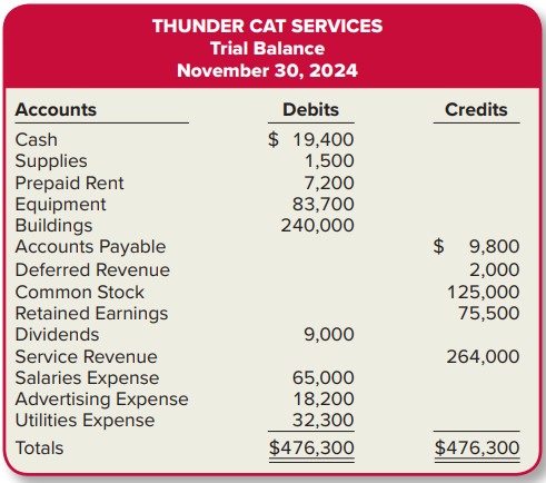 Thunder Cat Services specializes in training and veterinary services to household pets, such as dogs, birds, lizards, fish, horses, and of course, cats. After the first 11 months of operations in 2024, Thunder Cat has the following account balances.