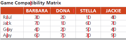 Tigers Sports Club has to select four separate coed doubles teams to participate in an interclub table tennis tournament. The preselection results in the selection of a group of four menâRaul, Jack, Gray, and Ajayâand four womenâBarbara, Dona, Stella, and Jackie. Now, the task ahead lies in pairing these men and women in the best fashion. The following table shows a matrix that has been designed for this purpose, indicating how each of the men complements the game of each of the women. A higher score indicates a higher degree of compatibility in the games of the two individuals concerned. Find the best pairs.