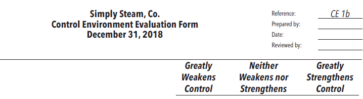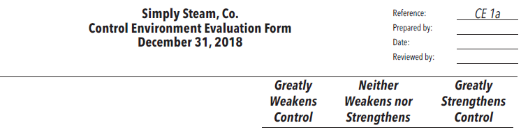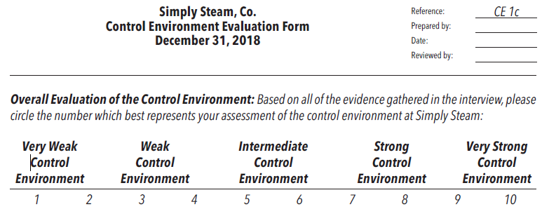 After reading the dialogue, you will make the overall assessment labeled, âOverall Evaluation of the Control Environment.â Unless otherwise notified by your instructor, please rate the effect each of the seven components has on the control environment at Simply Steam. When making your judgments, please circle the appropriate number according to the scales provided.