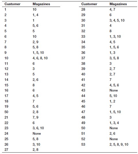 Data from the customer survey have begun to trickle in. The information about the 10 magazines to which a customer subscribes is provided on the returned questionnaire. Harris has asked you to develop a prototype model, which later can be used to decide which lists to purchase. So far only 53 surveys have been returned. To keep the prototype model manageable, Harris has instructed you to go ahead with the model development using the data from the 53 returned surveys. These data are shown in Table 15.4. The costs of the first 10 lists are given next, and your budget is $3,000.