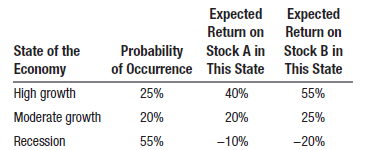 Expected Expected Return on Return on Probability Stock A in Stock B in of Occurrence This State State of the Economy This State High growth 25% 40% 55% Moderate growth 20% 20% 25% Recession 55% -10% -20%