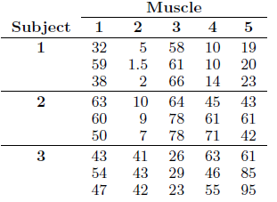 Muscle 1 Subject 2 3 4 5 1 32 5 58 10 19 59 1.5 61 10 20 38 2 66 14 23 63 10 64 45 43 60 78 61 61 50 7 78 71 42 3 43 41 26 63 61 54 43 29 46 85 47 42 23 55 95 2.