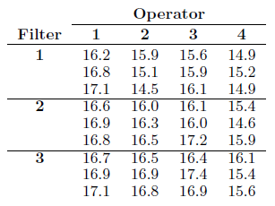 Operator Filter 1 2 3 4 1 16.2 15.9 15.6 14.9 16.8 15.1 15.9 15.2 17.1 14.5 16.1 16.1 16.0 14.9 16.6 15.4 16.9 16.3 16.0 14.6 16.8 16.5 17.2 15.9 16.5 16.4 16.1 16.9 16.9 17.4 15.4 3 16.7 17.1 16.8 16.9 15.6