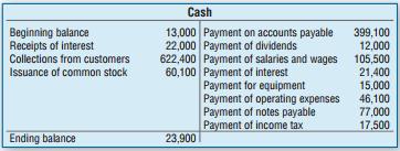 Cash 13,000 Payment on accounts payable 22,000 Payment of dividends 622,400 Payment of salaries and wages 60,100 Payment of interest Payment for equipment Payment of operating expenses Payment of notes payable Payment of income tax Beginning balance Receipts of interest Collections from customers Issuance of common stock 399,100 12,000 105,500 21,400 15,000 46,100 77,000 17,500 Ending balance 23,900